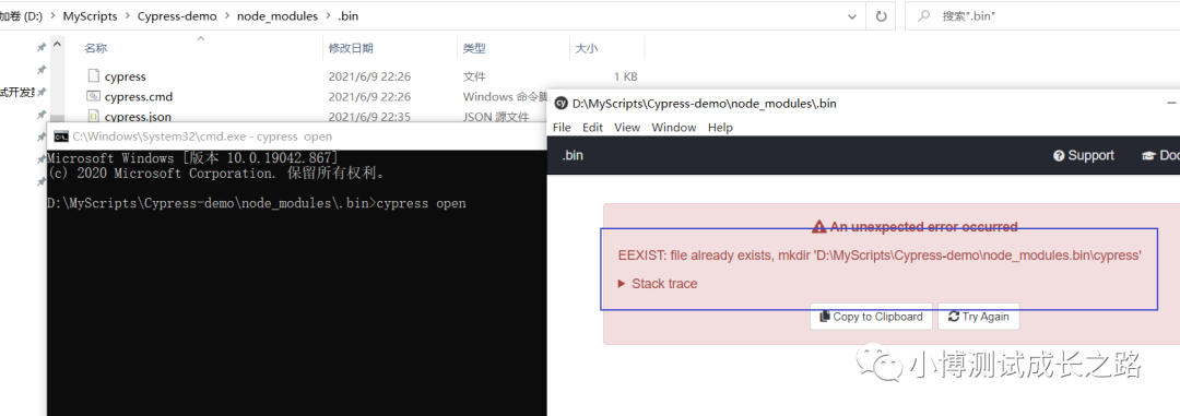 2、不要进入到node_modules/.bin目录下去执行启动命令,否则会报下面的错误:因为.bin目录下已经有一个cypress命令,无法在这个目录下再生成cypress文件夹了。