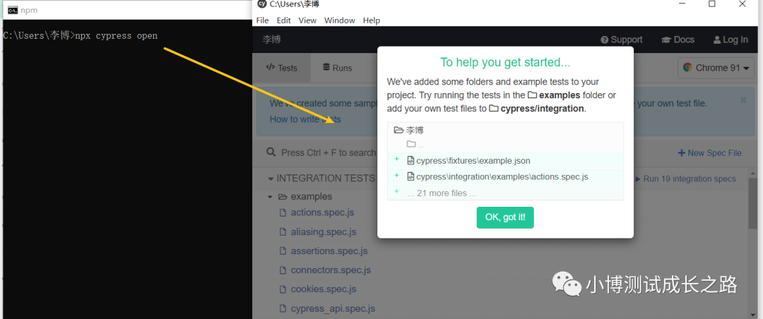 能够正常打开以上页面的话,就表示cypress环境安装成功了。