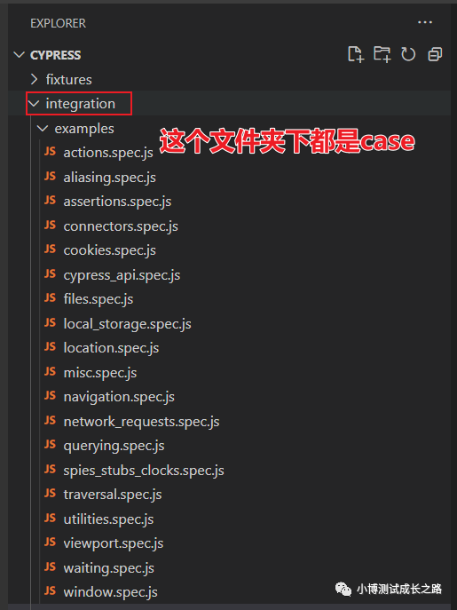 创建一个项目成功启动后,在项目根目录下用命令启动cypress时,会在根目录生成一个cypress的文件夹,里面有一些写好的现成的测试case:
