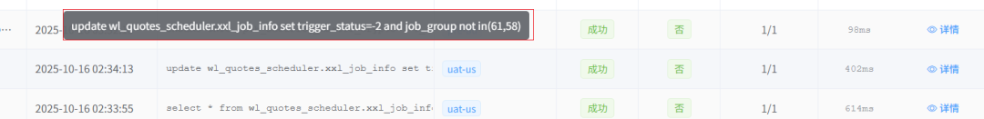 SET trigger_status =(-2AND(job_group NOTIN(61,58)))所以整张表的 trigger_status 被批量改了 。