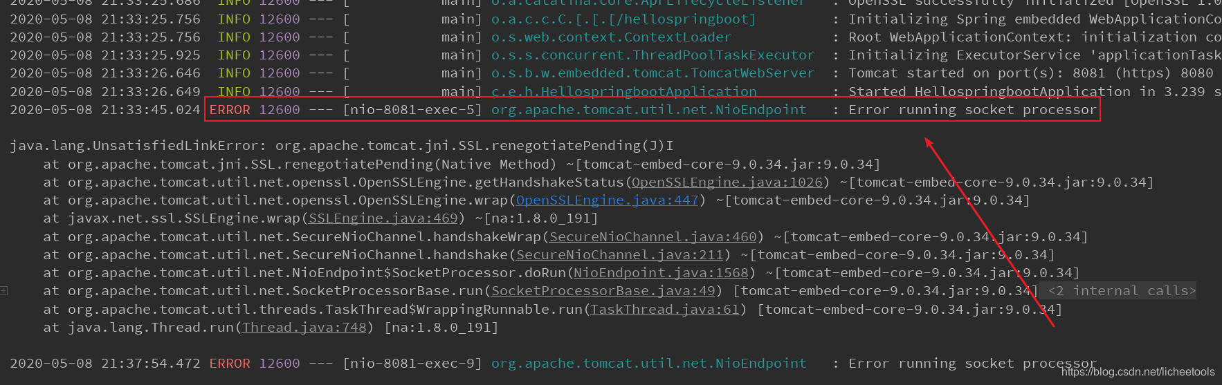 在使用Spring Boot 2.1.14版本配置HTTPS后,使用https的链接无法访问,且控制台输出以下信息:
