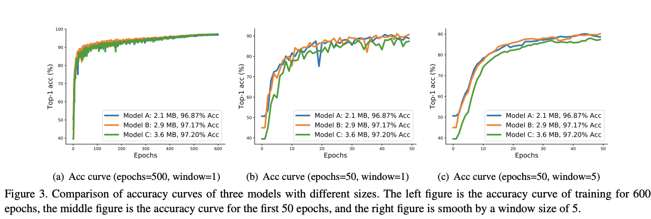 图3训练了3个不同大小的模型,在训练600轮后,模型的准确率与其大小相关,从前50轮的曲线可以看出小模型陷阱的原因: