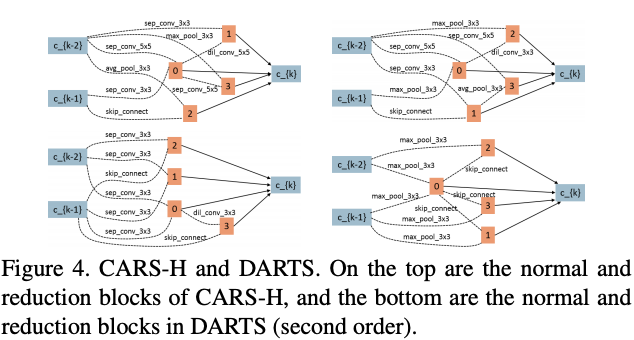 CARS-H与DARTS参数相似,但准确率更高,CARS-H的reduction block包含更多的参数,而normal block包含更少的参数,大概由于EA有更大的搜索空间,而基因操作能更有效地跳出局部最优解,这是EA的优势