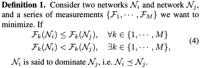 对于结构的优化过程,使用NSGA-III算法的non-dominated排序策略进行。标记 { N 1 , . . . , N N } \{\mathcal{N}_1,...,\mathcal{N}_N\} {N1,...,NN}为 N N N个不同的网络, { F 1 , . . . , F M } \{\mathcal{F}_1,...,\mathcal{F}_M\} {F1,...,FM}为希望优化的 M M M个指标,一般这些指标都是有冲突的,例如参数量、浮点运算量、推理时延和准确率,导致同时优化这些指标会比较难