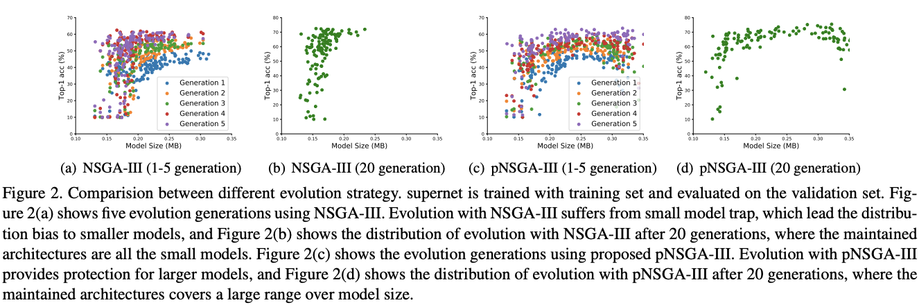 尽管non-dominated排序能帮助选择的更好网络,但搜索过程仍可能会存在小模型陷阱现象。由于超网的参数仍在训练,所以当前轮次的模型不一定为其最优表现,如果存在一些参数少的小模型但有比较高的准确率,则会统治了整个搜索过程。因此,论文基于NSGA-III提出pNSGA-III,加入准确率提升速度作为考虑