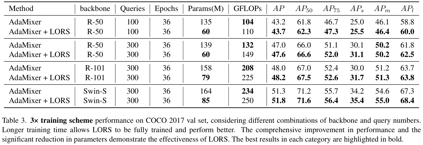 表 3 展示了AdaMixer+LORS方法在不同骨干网和查询数的3×训练方案下的性能。