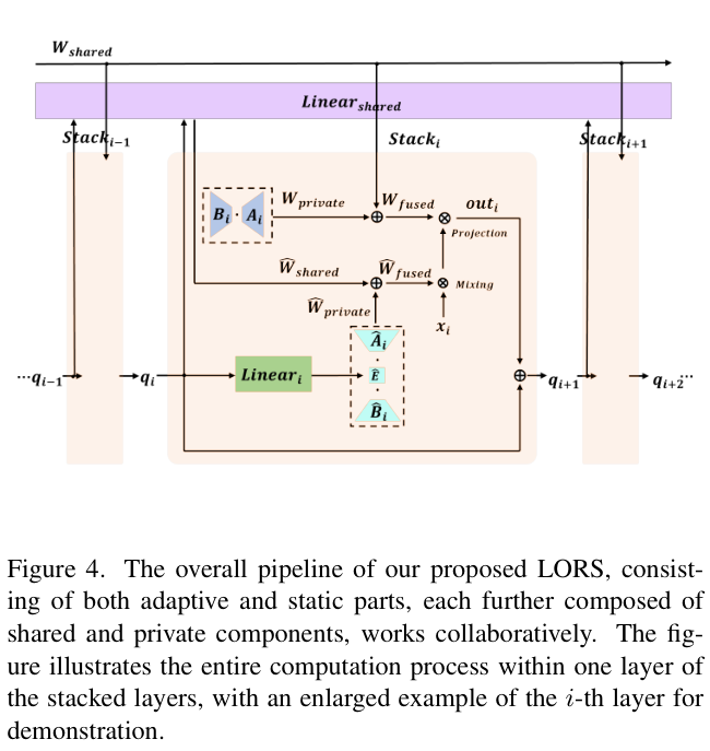 基于上述考虑,论文建议将堆叠模块的参数分解为两部分:代表共性的共享参数和捕获特定特征的私有参数。共享参数可供所有模块使用并共同训练,而私有参数则由每个模块单独拥有,在保持模型性能的同时减少参数量。为了实现这一目标,受LoRA方法的启发,论文引入了低秩残差结构 (LORS) 的概念,本质上是将私有参数添加到共享参数中,就像残差连接将残差信息添加到特征中一样。