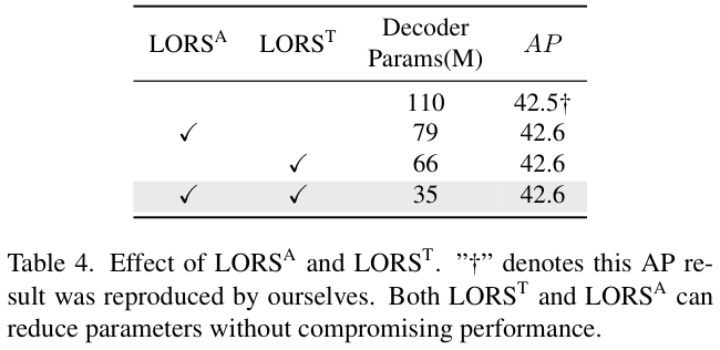 表 4 展示了 L O R S A \mathrm{LORS}^\mathrm{A} LORSA 和 L O R S T \mathrm{LORS}^\mathrm{T} LORST 对模型参数和性能的影响进行消融研究