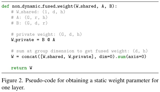 W i = W s h a r e d + W i p r i v a t e ( 7 ) W_{i}=W^{\mathrm{shared}}+W_{i}^{\mathrm{private}} \quad\quad(7) Wi=Wshared+Wiprivate(7)