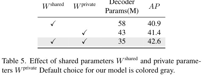表 5 对比了共享权重和私有权重中哪一个对解码器的性能影响更大。