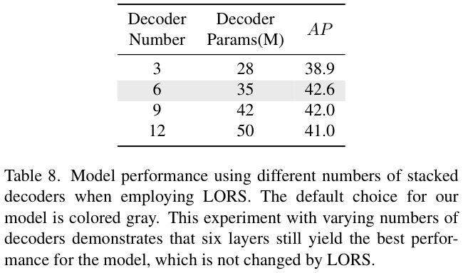 表 8 对结合LORS结构的最佳解码器层数进行实验对比。