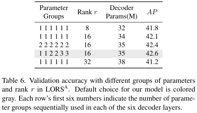表 6 探索了自适应LORS的最佳参数组数量和秩