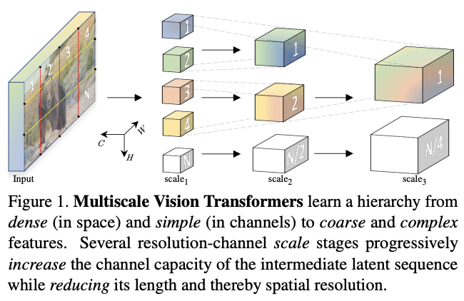 论文提出了用于视频和图像识别的多尺度ViT(MViT),将FPN的多尺度层级特征结构与Transformer联系起来。MViT包含几个不同分辨率和通道数的stage,从小通道的输入分辨率开始,逐层地扩大通道数以及降低分辨率,形成多尺度的特征金字塔。