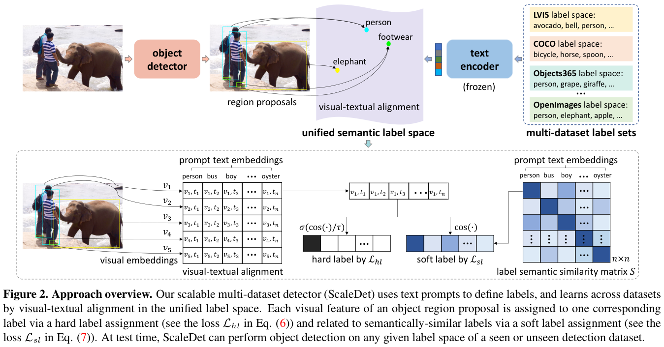 ScaleDet通过统一不同的标签集以形成统一的标签语义空间(图2顶部)进行跨数据集学习,并通过硬标签和软标签分配实现视觉文本对齐来进行训练(图2底部)。
