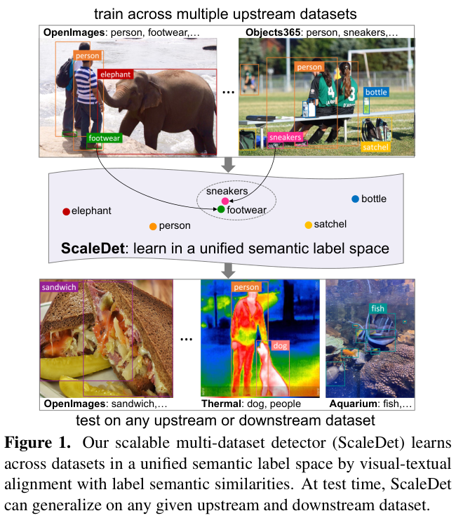 ScaleDet),可通过增加训练数据集来扩大其跨数据集的泛化能力。与现有的主要依靠手动重新标记或复杂的优化来统一跨数据集标签的多数据集学习器不同,论文引入简单且可扩展的公式来为多数据集训练产生语义统一的标签空间,通过视觉文本对齐进行训练,能够学习跨数据集的标签语义相似性来进行标签分配。经过训练后,ScaleDet可以很好地泛化任意具有可见和不可见类的上游和下游数据集来源:晓飞的算法工程笔记 公众号