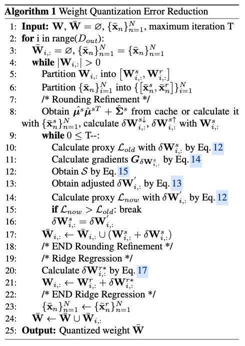 Wi,:r 仍然保持为全精度,并将在下一次迭代中处理。该过程持续进行,直到所有权重被准确量化。所提出的Rounding Refinement和Ridge Regression共同形成了Wqer,其整体过程在算法1中给出。在实践中,对多个输出通道并行执行Wqer。