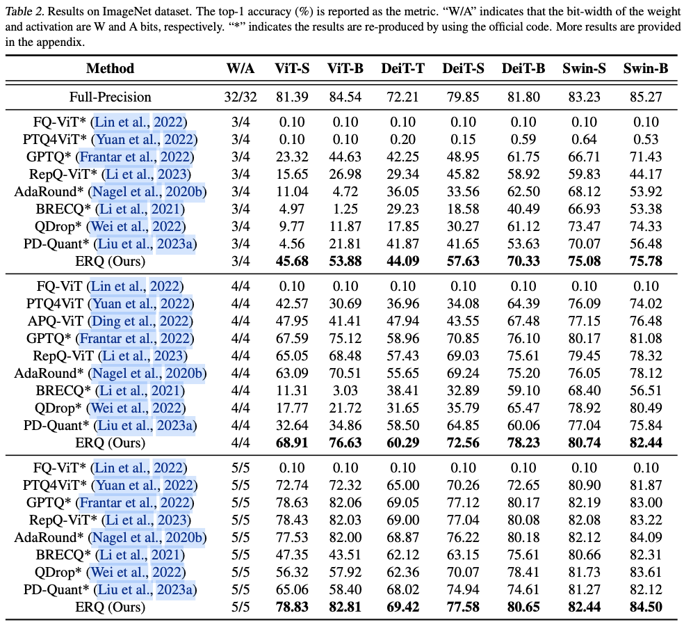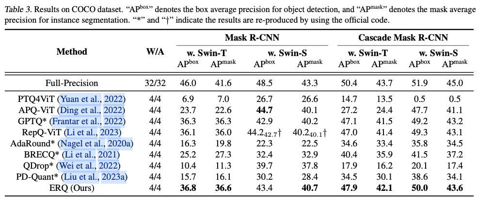 ERQ在对各种ViTs变体(ViT、DeiT和Swin)及任务(图像分类、目标检测和实例分割)进行的广泛实验中证明了其有效性。值得注意的是,在图像分类任务中,ERQ在W3A4 ViT-S上比GPTQ的性能提高了22.36%。
