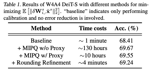 δWi,:s 。如表1所示,将方程12作为MIPQ的目标将时间成本从约130小时降低到约10小时。然而,由于当前开源的MIPQ实现仅支持CPU,无法充分利用GPU的能力,这样的成本仍然是适度的。接下来将介绍Rounding Refinement,一种支持GPU的方法,利用代理的梯度更快地调整