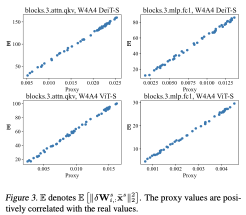 E[∥δWi,:sxˉs∥22] 之间的关系。可以看出,所提出的代理与真实值成比例,证明了其可信度。