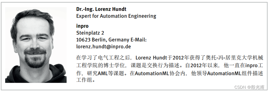 笔者在德国柏林工业大学读硕期间,于2019-2020有幸在柏林inpro公司的生产系统和信息工程部门参与AutomationML领域的工作。部门同事兼我的论文导师Dr.-Ing. Lorenz Hundt 作为AutomationML委员会的一员,主持了AutomationML白皮书-Part6:《AutomationML 组件》的编撰。