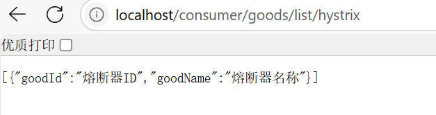 (5)启动完成后,我们在浏览器中访问服务消费者的接口 http://localhost/consumer/goods/list/hystrix,返回结果如下图,正好是我们在服务提供者中备选响应值。
