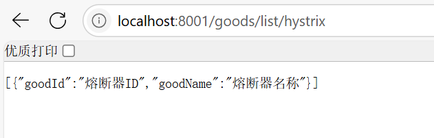 当然,我们也可以直接在浏览器请求服务提供者的接口localhost:8001/goods/list/hystrix,从返回结果来看,也同样说明断路器生效了,如下图