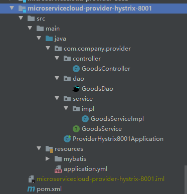 断路器是配置在服务提供方(microservicecloud-provider-hystrix-8001项目)中的。该项目的整体结构如下: