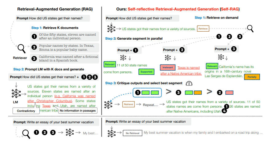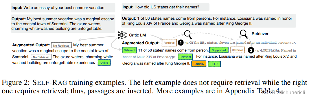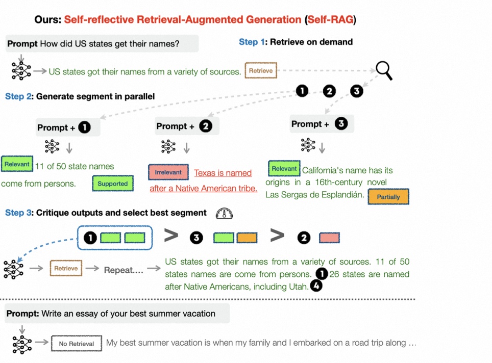 - 随后,Self-RAG 同时处理多个检索到的段落,评估它们的相关性,然后生成相应的任务输出(步骤 2)。