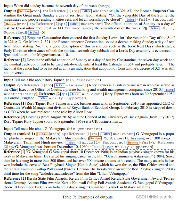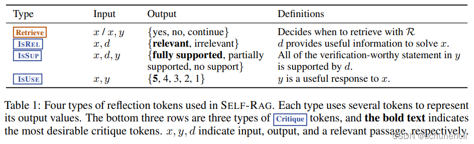 - 批评令牌:模型在生成每个输出段落之后,会生成一种或多种批评令牌来评估生成内容的质量、相关性和信息支持程度。比如,模型可能会生成“ISREL”、“ISSUP”等令牌来评判所检索到的段落是否相关,生成的段落内容是否完全、部分或没有得到检索段落的支持。