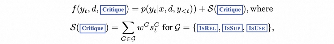 对于每个批判标记组 G(如 ISREL),将其在时间戳 t 的得分记为 sGt,并按如下方式计算片段得分: