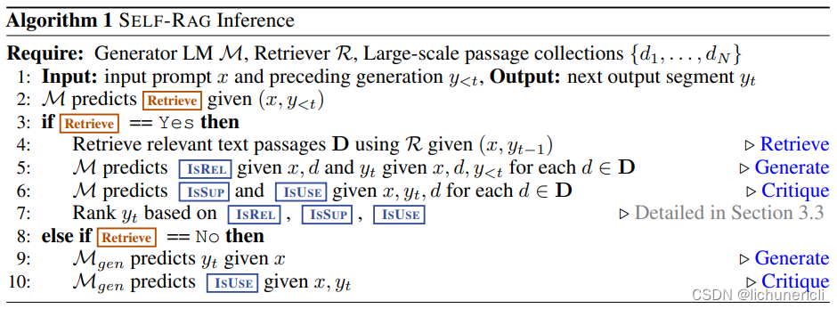 - 生成:如果不需要检索,模型会预测下一个输出段。如果需要检索,模型首先生成批评令牌(critique token)来评估检索到的文档是否相关,然后根据检索到的段落生成后续内容。
