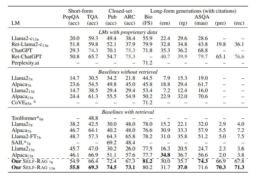 Self-RAG学习检索、生成和批评,以提高 LM 的输出质量和真实性,在六项任务上优于 ChatGPT 和检索增强的 LLama2 Chat。