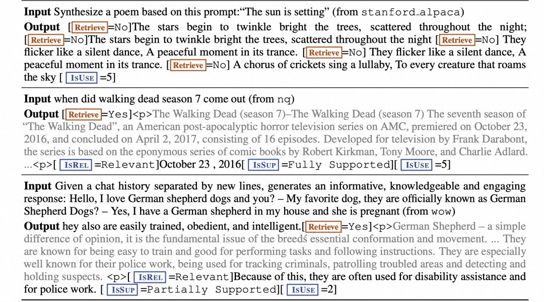 SELF-RAG 并行处理多个段落以生成每个段落,并使用自己生成的反射标记对生成的任务输出执行软约束或硬控制。例如: