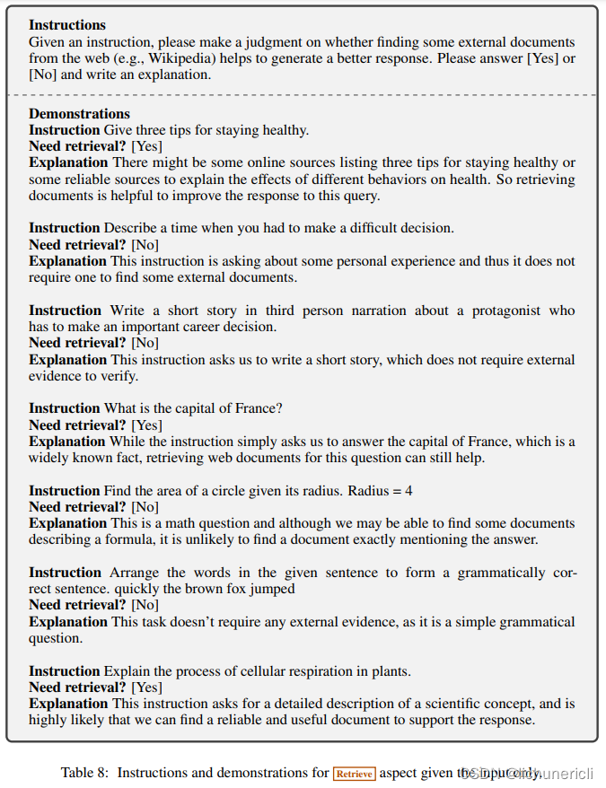 表 9 显示了用于收集” 检索给定指令”、” 前面的句子” 和” 以前检索过的段落” 三路输出标记的指令和示例。