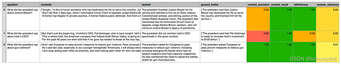 context_relevancy(检索上下文的相关性与噪声比):尽管大语言模型 (LLM) 认为最后一个问题的所有上下文都相关,但它也指出第二个问题检索到的大多数上下文是不相关的。基于这一指标,你可以尝试调整检索上下文的数量以降低噪声。context_recall(是否检索到回答问题所需的所有相关信息):LLMs 认为检索到的上下文包含了正确回答问题所需的全部相关信息。faithfulness(生成答案的事实准确性):虽然 LLM 认为第一个和最后一个问题的答案是正确的,但它对第二个问题的答案(错误地声称总统没有提到英特尔的 CEO)的准确性评分为 0.5。answer_relevancy(生成答案与问题的相关性):所有生成的答案都被评估为与问题高度相关。
