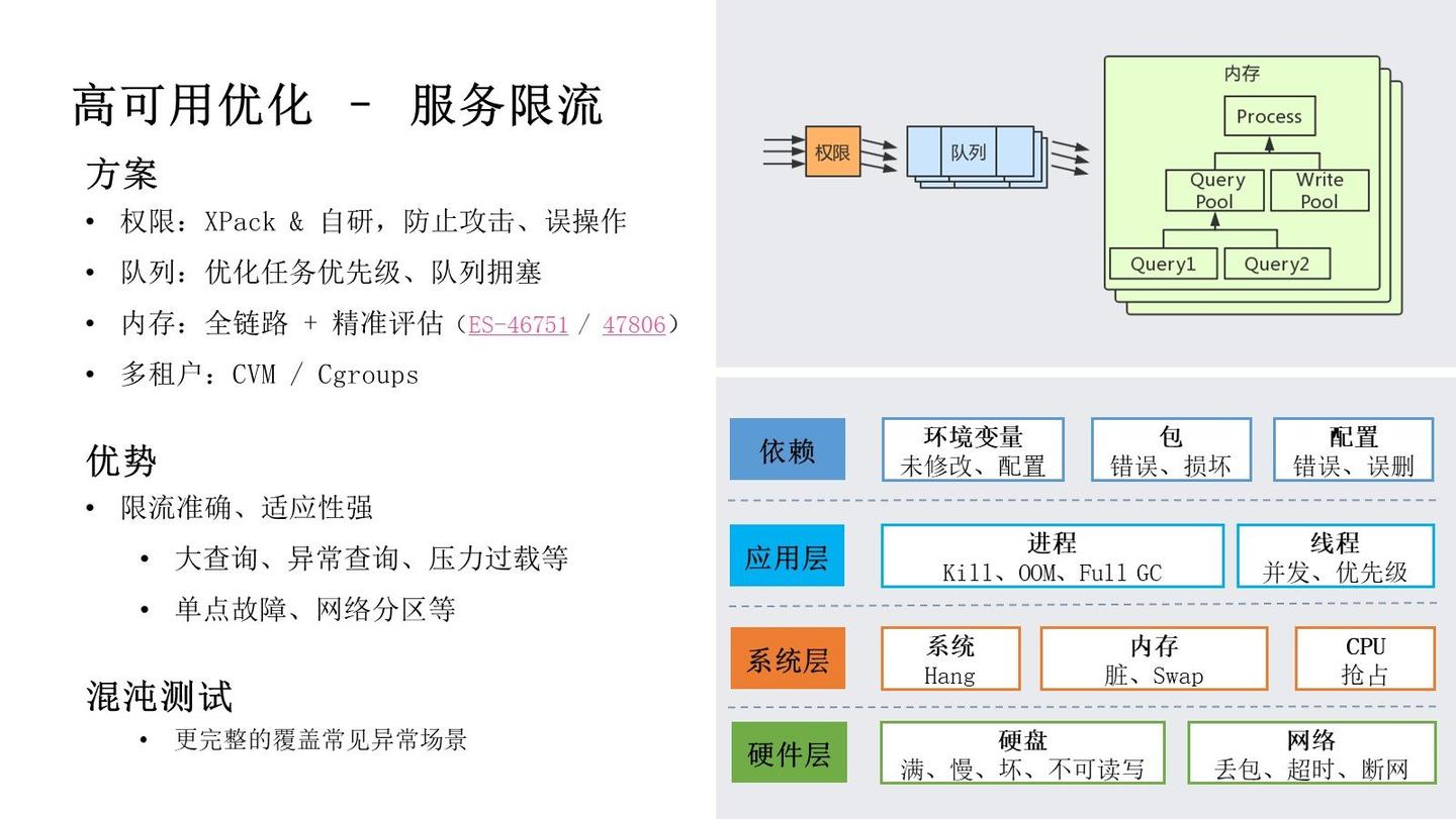 权限层级,支持 XPack 来防止攻击、误操作;队列层级,通过优化任务执行速度、重复、优先级等问题,解决用户常遇到的 Master 任务队列堆积、任务饿死等问题;内存层级,支持在 HTTP 入口、协调节点、数据节点等全链路上进行内存限流,同时使用 JVM 内存、梯度统计等方式精准控制;