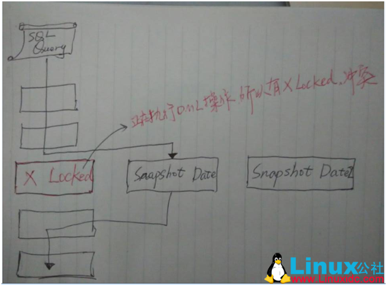 一致性的非锁定行读(consistent nonlocking read,简称CNR)是指InnoDB存储引擎通过行多版本控制(multi versioning)的方式来读取当前执行时间数据库中运行的数据。如果读取的行正在执行delete、update操作,这时读取操作不会因此而会等待行上锁的释放,相反,InnoDB存储引擎会去读取行的一个快照数据,如下图所示: