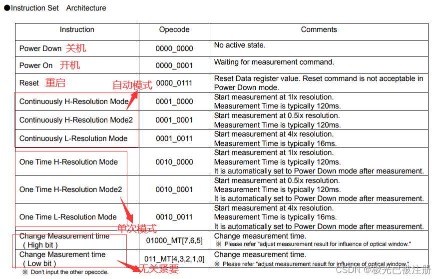 第一列为功能,第二列为具体的数值,第三列为功能的补充说明。举例:第四行写的是自动测量高分辨率模式,想要实现这个功能,你需要往传感器中发送0x10。这样,每大约120ms,传感器会得到一个数据,这个数据的精度为1lx,你通过IIC读取这个数据即可。