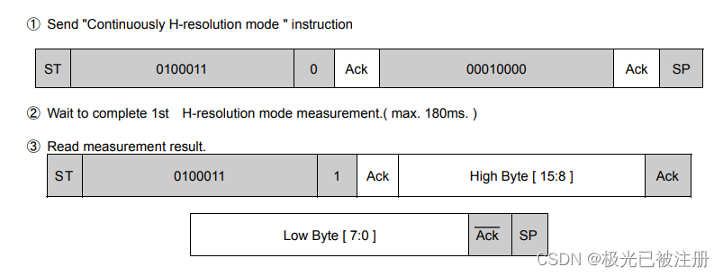 序号2:等待最多180ms,这段时间,BH1750正在采集数据,并将数据存入到寄存器之中。