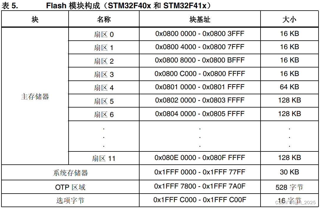 STM32F4的主存储器块分为 4个 16KB 扇区、1个 64KB 扇区和 7个 128KB 扇区