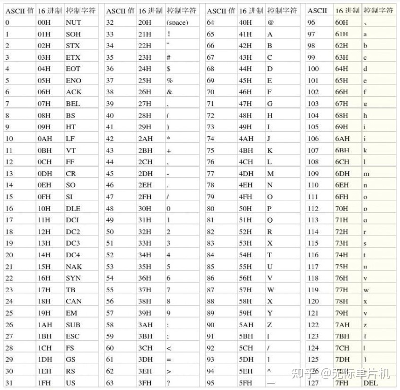ASCII码表分为两部分,第一部分是控制字符和通讯专用字符,它们的数字编码从0~31,它们并没有特定的图形显示,但会根据不同的应用程序,对文本显示有不同的影响。ASCII码的第二部分包括空格、阿拉伯数字、标点符号、大小写英文字母以及 “DEL(删除控制)”,这部分符号的数字编码从32~127,除最后一个DEL符号外,都能以图形的方式来表示,它们属于传统文字书写系统的一部分。