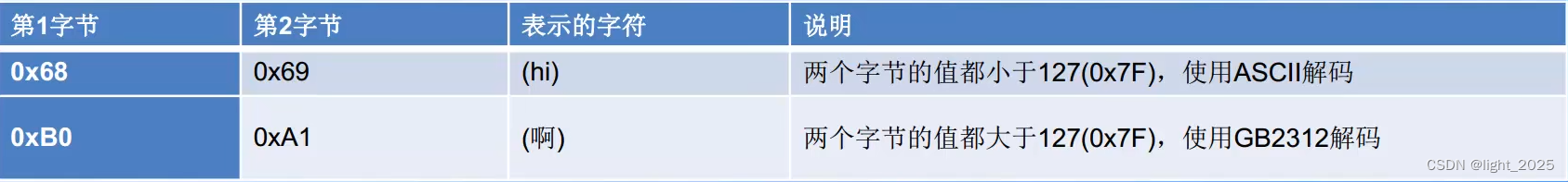 如上表,当我们设定系统使用GB2312标准的时候,他遇到一个字符串时,会按字节检测字符值的大小,若遇到连续两个字节的数值都大于127时就把这两个连续的字节合在一起,用GB2312解码,若遇到的数值小于127,就直接用ASCII把它解码。