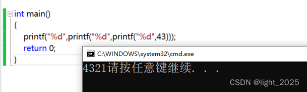 首先先分析这个结构,第三个printf函数,显然打印结果是 43;但是第二个 printf函数,我们不能天真的认为第二个 printf函数 打印 43;这里要注意 printf函数 的返回值,第二个 printf函数 是打印第三个 printf函数 的返回值。