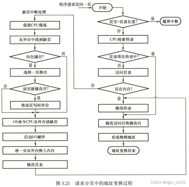请求分页系统中的地址变换机构,是在分页系统地址变换机构的基础上,为实现虚拟内存,又增加了某些功能而形成的,如产生和处理缺页中断,及从内存中换出一页的功能等等。