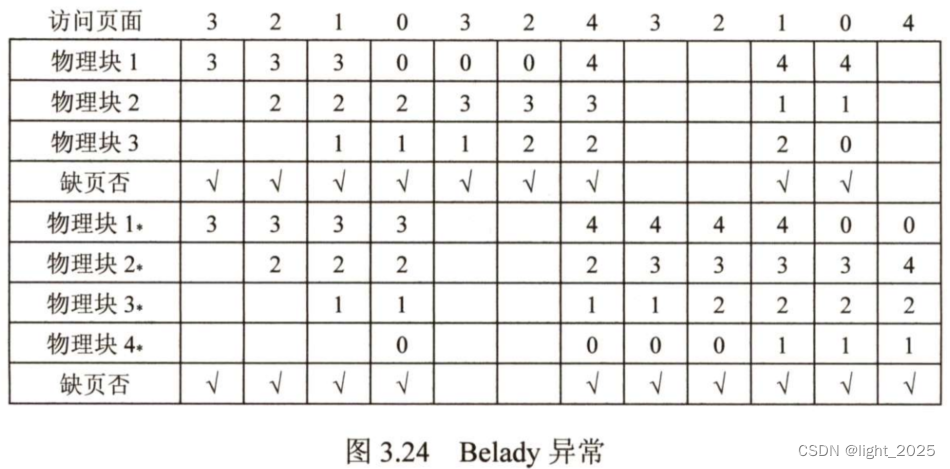 若采用 FIFO 置换算法,当分配的物理块为 3 个时,缺页次数为 9 次;当分配的物理块为 4 个时,缺页次数为 10 次。分配给进程的物理块增多,但缺页次数不增反减。