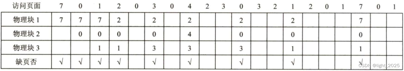 可以看到,发生缺页中断的次数为 9 (分别是访问页面 7 0 1 2 3 4 0 1 7 时),页面置换的次数为 6 (分别是 2 3 4 0 1 7 时)。表格中空的表示内存中原本就有该页面,无需发生缺页中断置换。