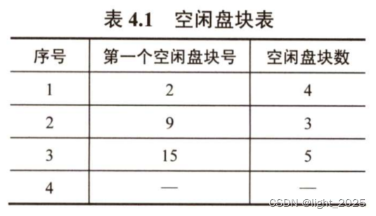 每个空闲区对应于一个空闲表项,其中包括表项序号、该空闲区的第一个盘块号、该区的空闲盘块数等信息。再将所有空闲区按其起始盘块号递增的次序排列;
