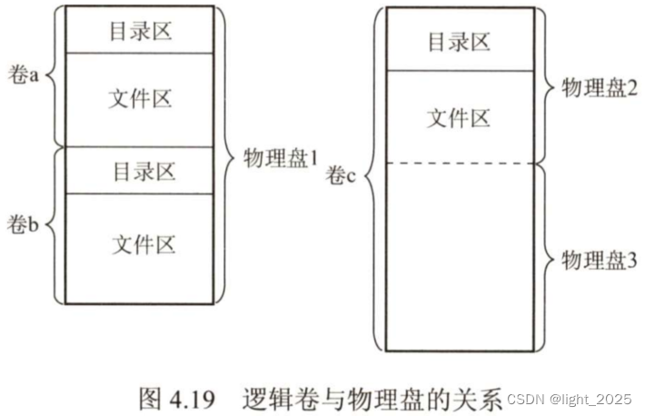 在一个卷中,存放文件数据的空间称为文件区,存放 FCB 的空间称为目录区,两者之间是分离的;由于存在很多种类的文件表示和存放格式,所以现代操作系统中一般都有很多不同的文件管理模块,通过它们可以访问不同格式的卷中的文件。卷在提供文件服务前,必须由对应的文件程序进行初始化,划分好目录区和文件区,建立空闲空间管理表格及存放卷信息的超级块。