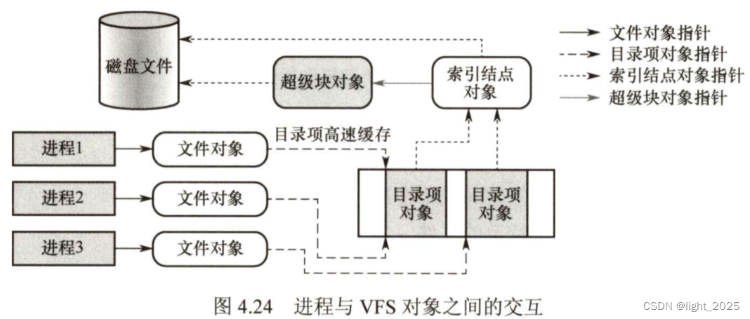 为了实现 VFS,Linux 主要抽象了四种对象类型。每个 VFS 对象都存放在一个适当的数据结构中,其中包括对象的属性和指向对象方法(函数)表的指针。