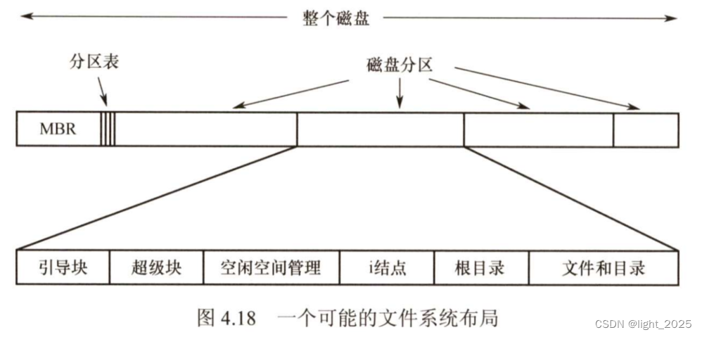 文件系统存放在磁盘上,多数磁盘划分为一个或多个分区,每个分区中有一个独立的文件系统。文件系统可能包括以下信息:启动存储在那里的操作系统的方式、总的块数、空闲块的数量和位置、目录结构以及各个具体文件等,